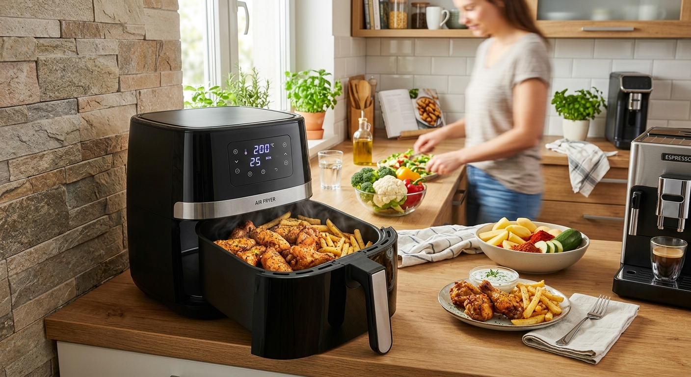 Hrustljavo brez slabe vesti je točno tisto, kar dobi vsak, ki prvič preizkusi cvrtnik na zrak – pomfrit, piščančja krilca, cvetača, celo mini krofi – zunaj hrustljavo, znotraj sočno, brez kopeli v olju.